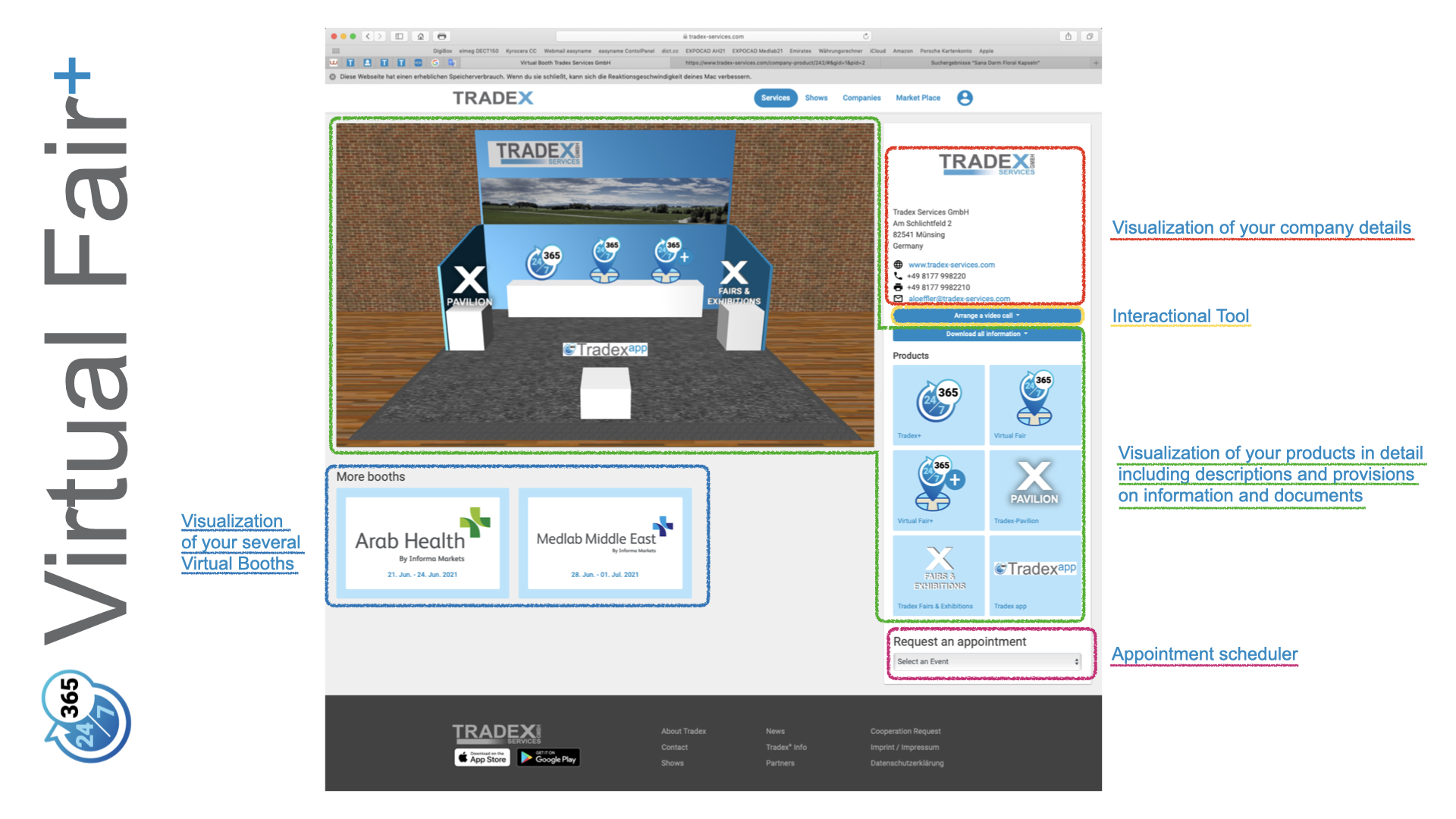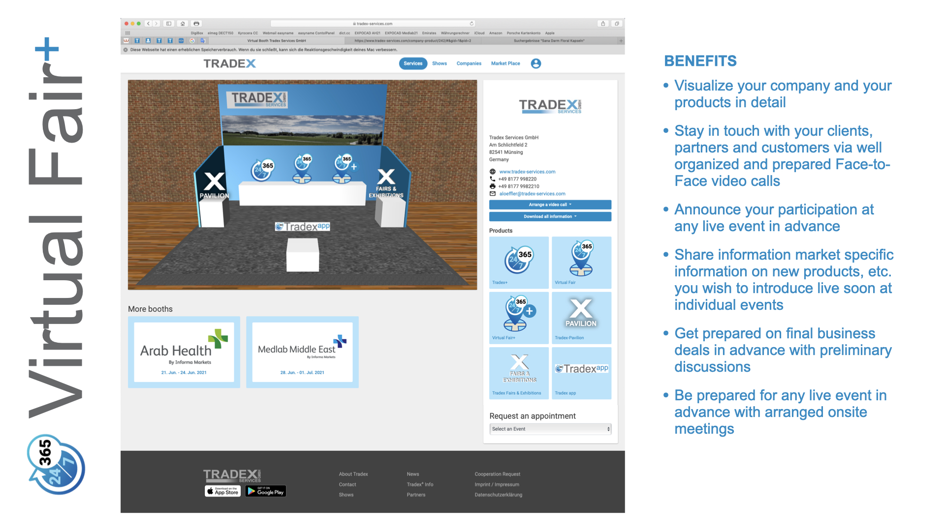 You can use VirtualFair+ easily, anytime and anywhere to initiate new business, to conduct existing business, to pre-organize upcoming events, announcing the launch of new products and services, etc...