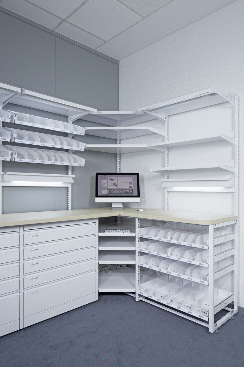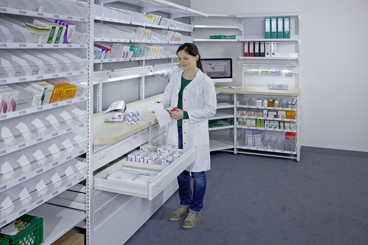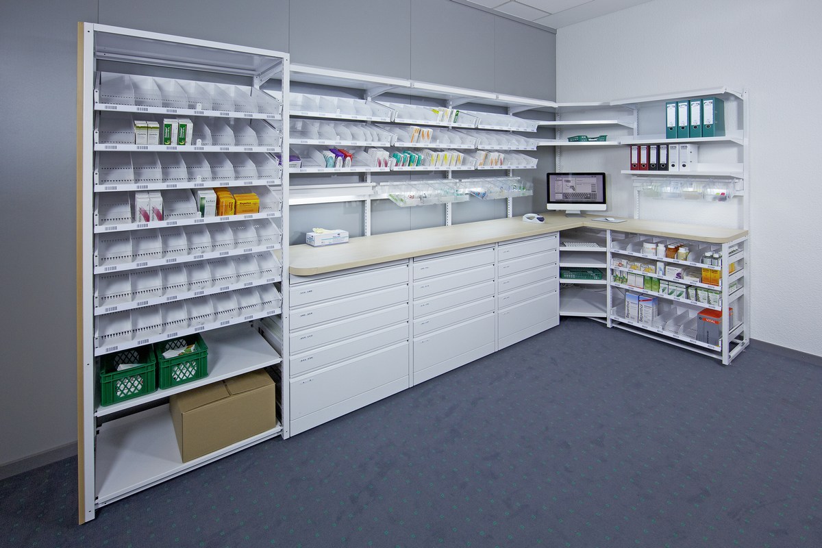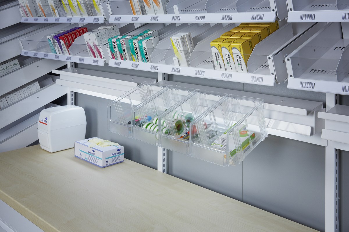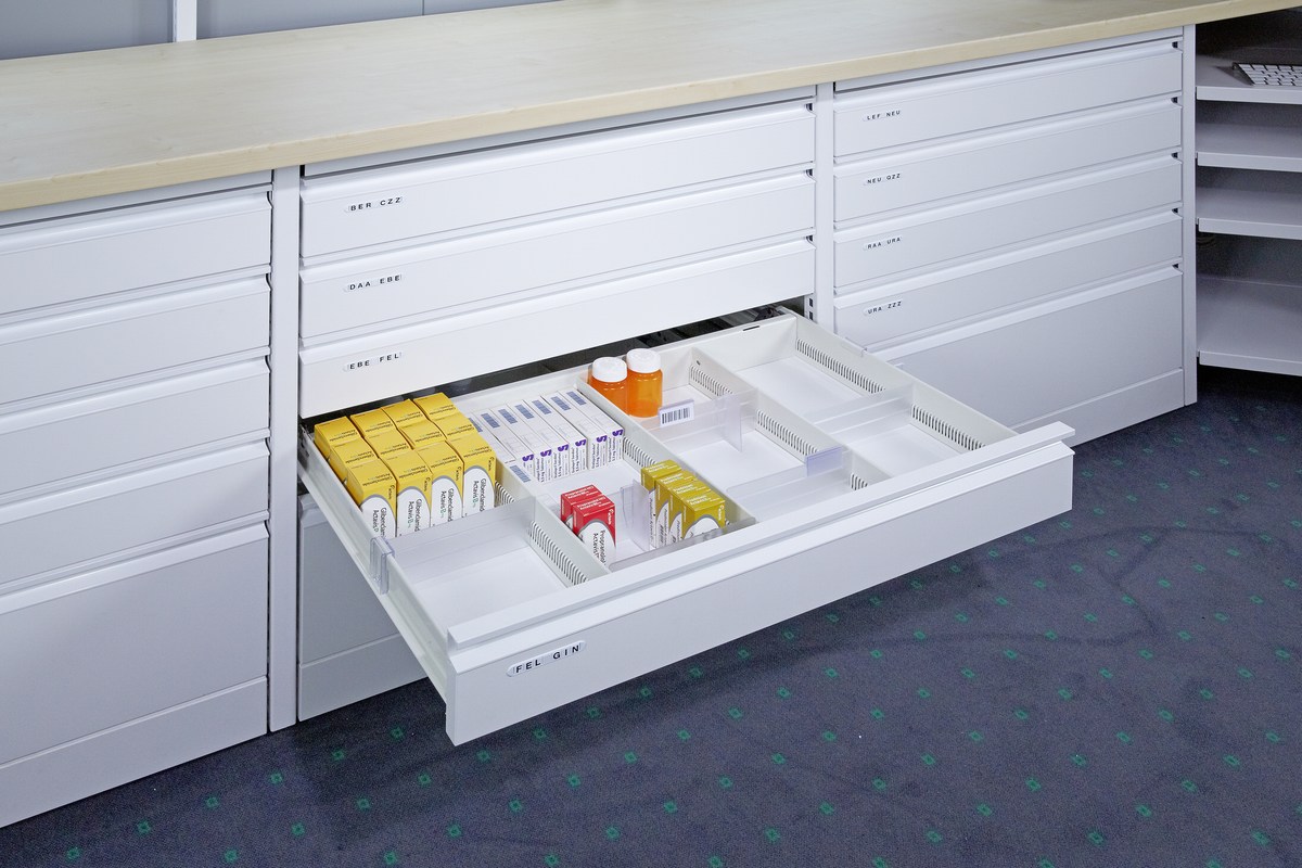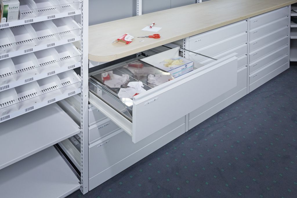 The FAMA Shelving System provides space-saving storage for medicine packages and items in daily use. It’s also specifically designed to store anything which needs to be kept free of dust for reasons of hygiene. We paid special attention to safety and workplace ergonomics, so all pull-out elements are extremely easy to operate. Special safety mechanisms ensure that the sloping trays are spring-cushioned and doubly secured when pulled out. FAMA Shelves are a safer option than conventional systems, in any working environment.