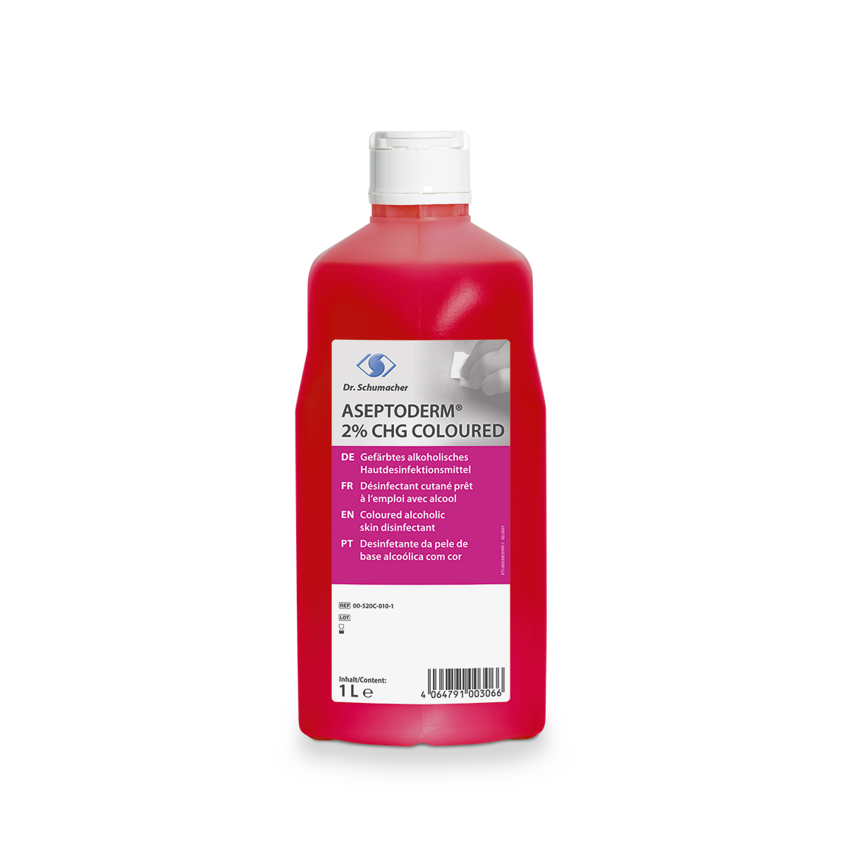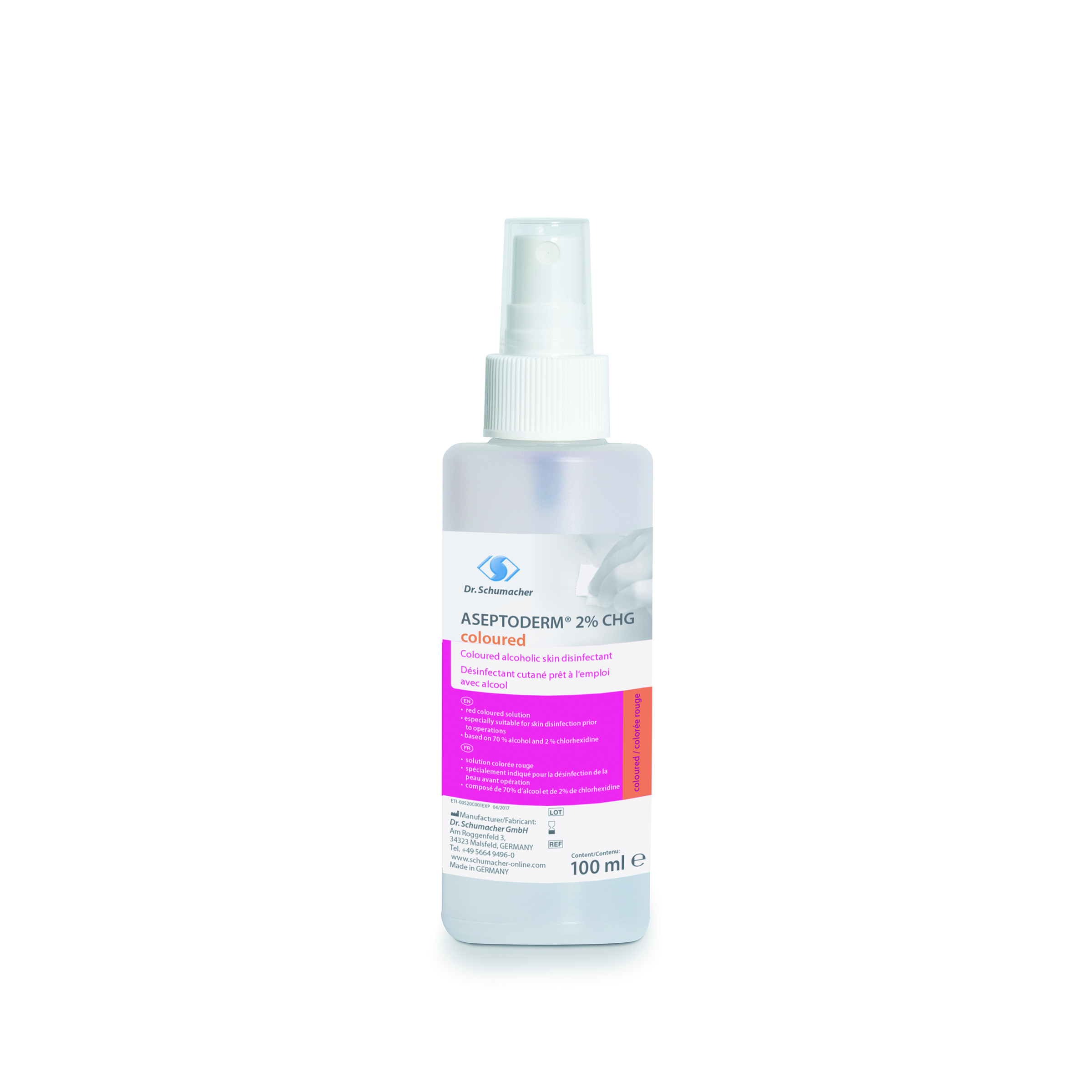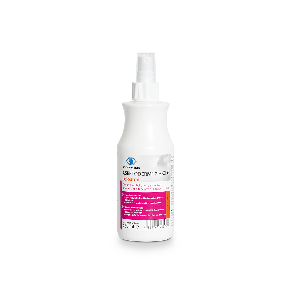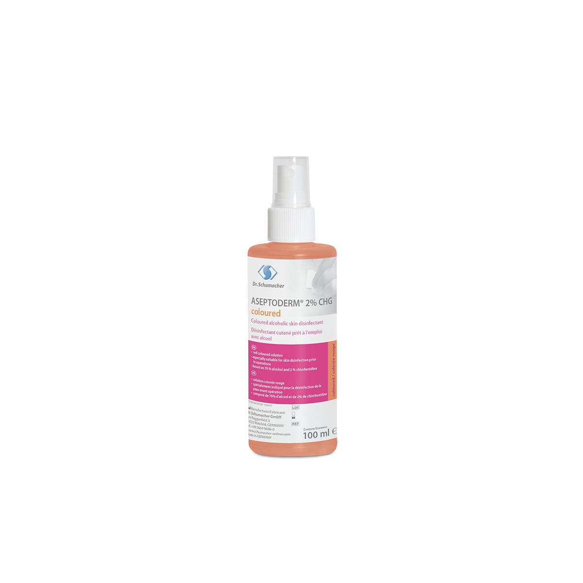 ASEPTODERM 2% CHG COLOURED is a ready-to-use, alcohol-based skin disinfectant. The red colouring helps mark the area on the skin that has been disinfected. It is primarily used as a pre- and post-operative skin disinfectant and can also be used for skin disinfection prior to injections, incisions, punctures, blood withdrawals, catheter insertions, minor surgical interventions and minor accidental injuries. ASEPTODERM 2% CHG COLOURED is gentle to the skin and free from aldehydes, phenols and quarternary ammonium compounds. Available also as a spray bottle.