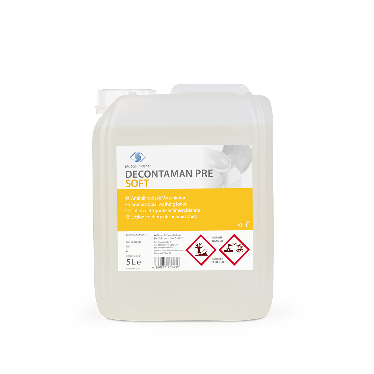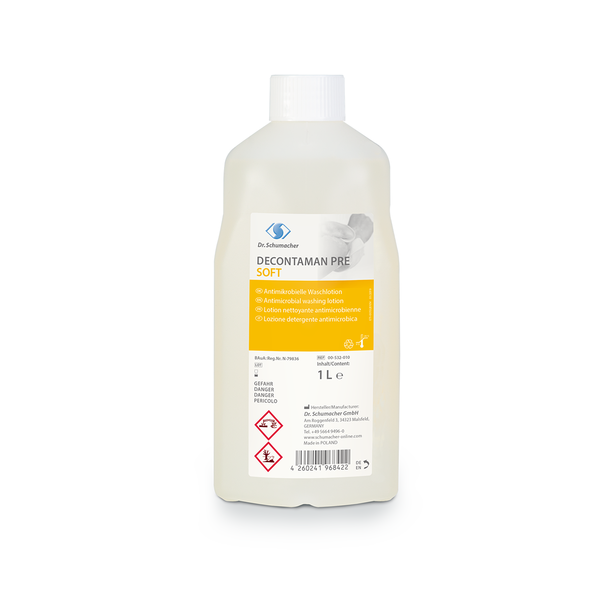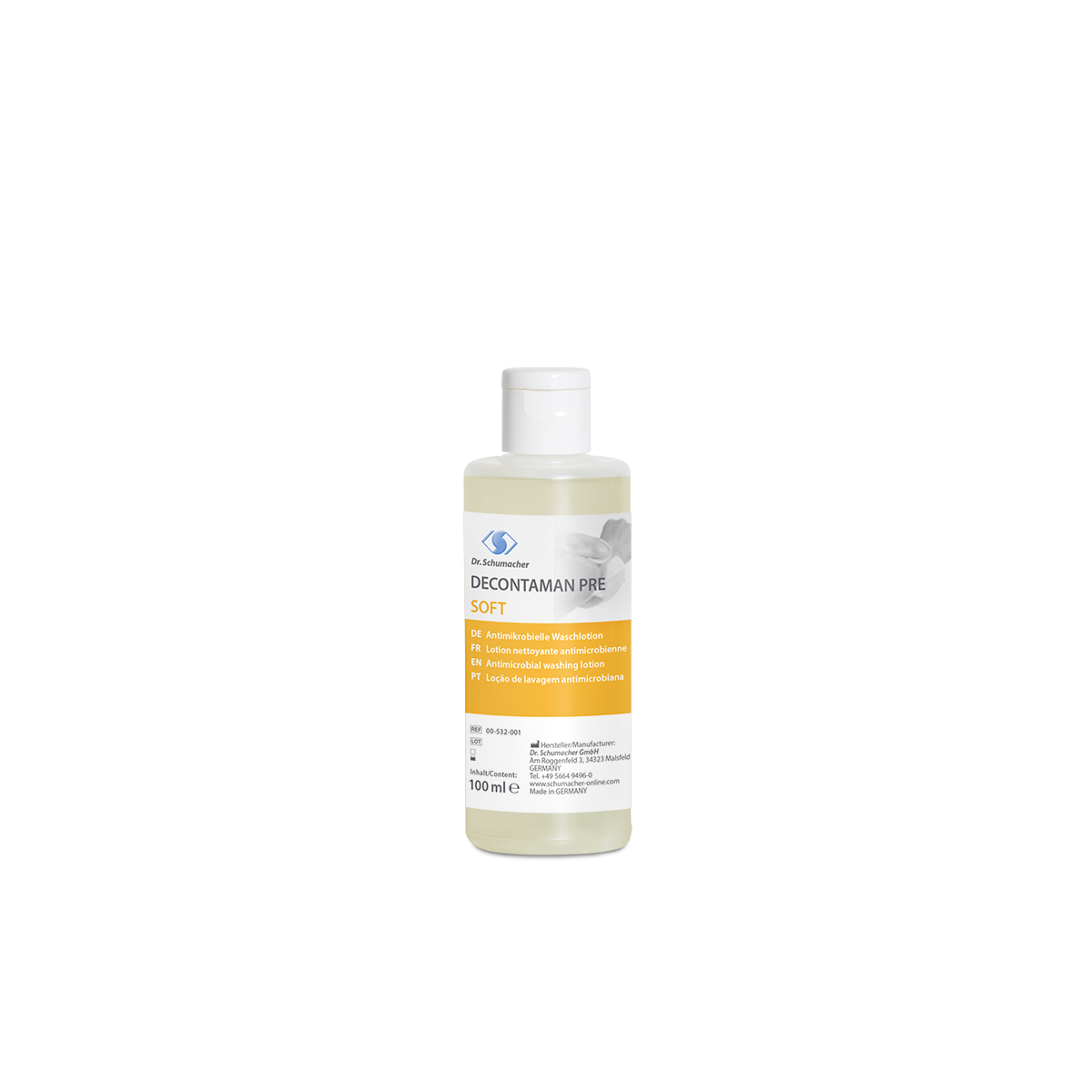 DECONTAMAN PRE SOFT is an antimicrobial cleansing lotion to simultaneously clean and decontaminate skin and hands.DECONTAMAN PRE SOFT is suitable for preoperative body washing and hygienic hand washing in accordance with VAH and EN 1499 as well as for wholebody washing in cases of MRSA contamination orcontamination with other multi-resistant Gram-negative bacteria (MRGN) such as Acinetobacter baumannii or vancomycinresistant enterococci (VRE). Because of the skinfriendly pH and the conditioning properties, DECONTAMAN PRE SOFT has very good skin compatibility suitable for a nourishing cleansing lotion.Through the use of DECONTAMAN PRE SOFT, the chain of infection from hand to hand during medical and nursing procedures as well as transfer to food during meal preparation can be effectively broken.
