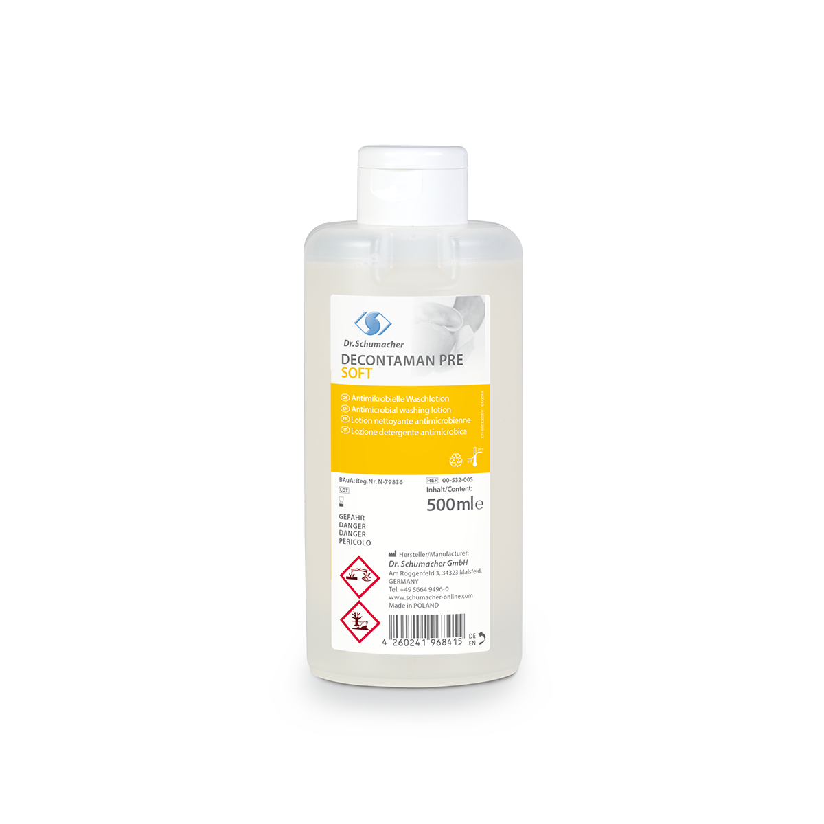 DECONTAMAN PRE SOFT can be used for skin cleansing prior to surgery or during longer periods of bed confinement. The product is free of phenols as well as alcohols and colorants.