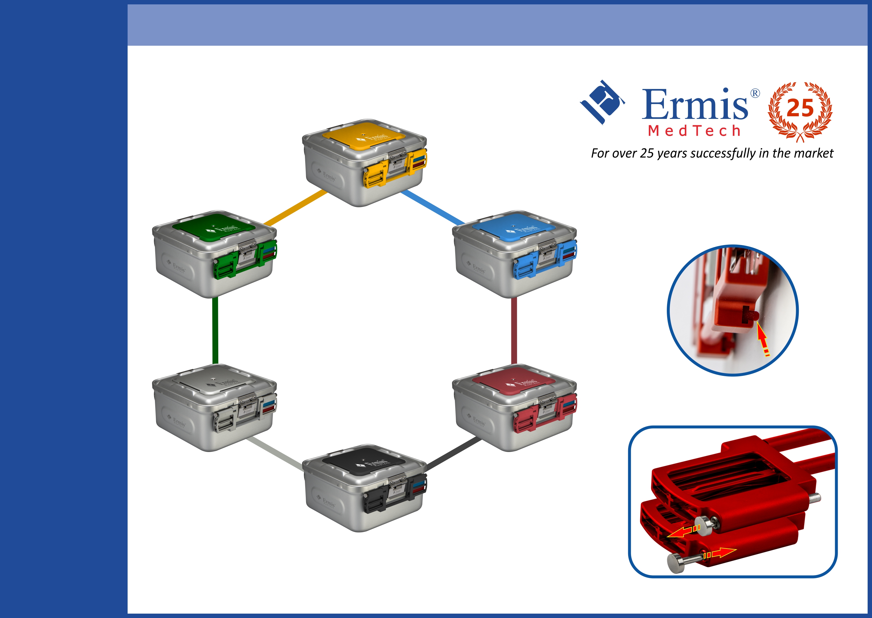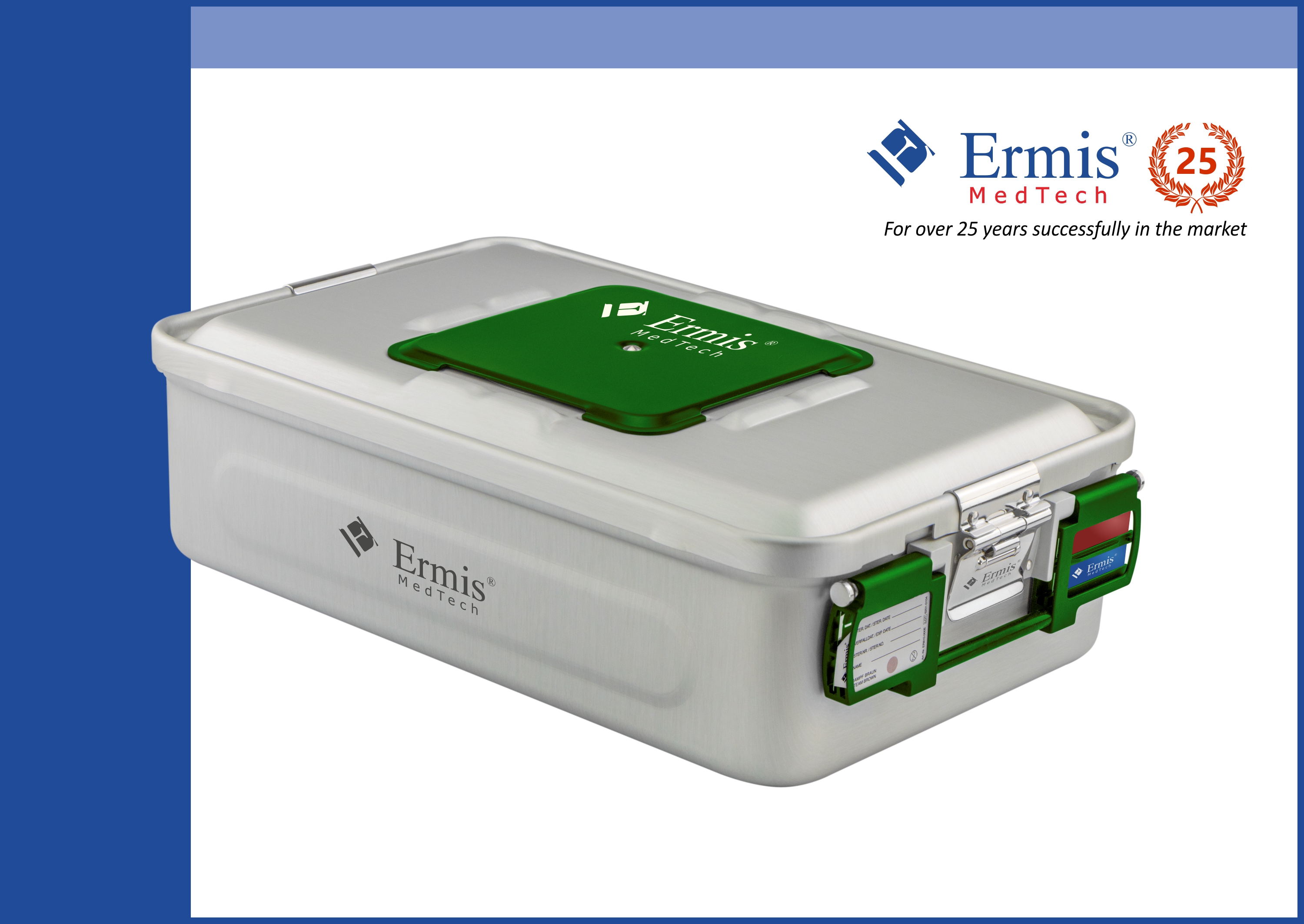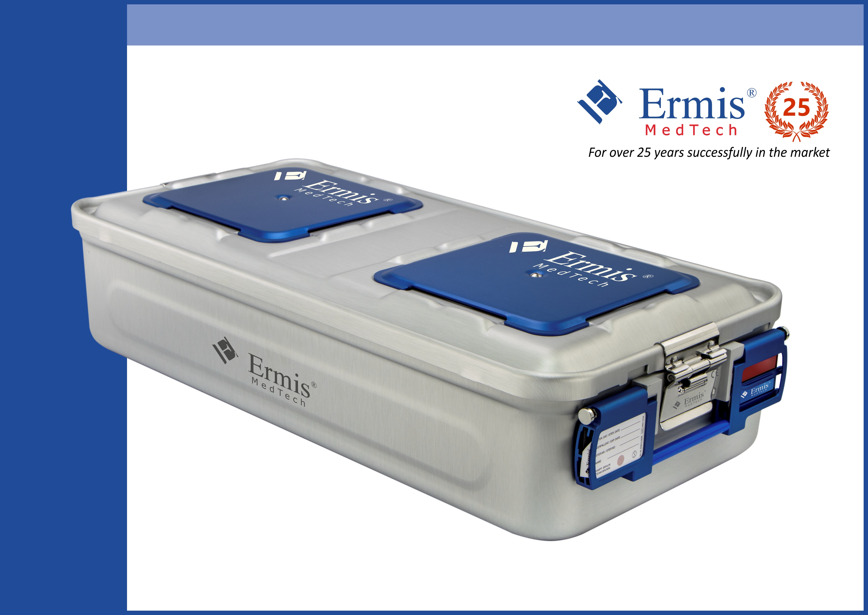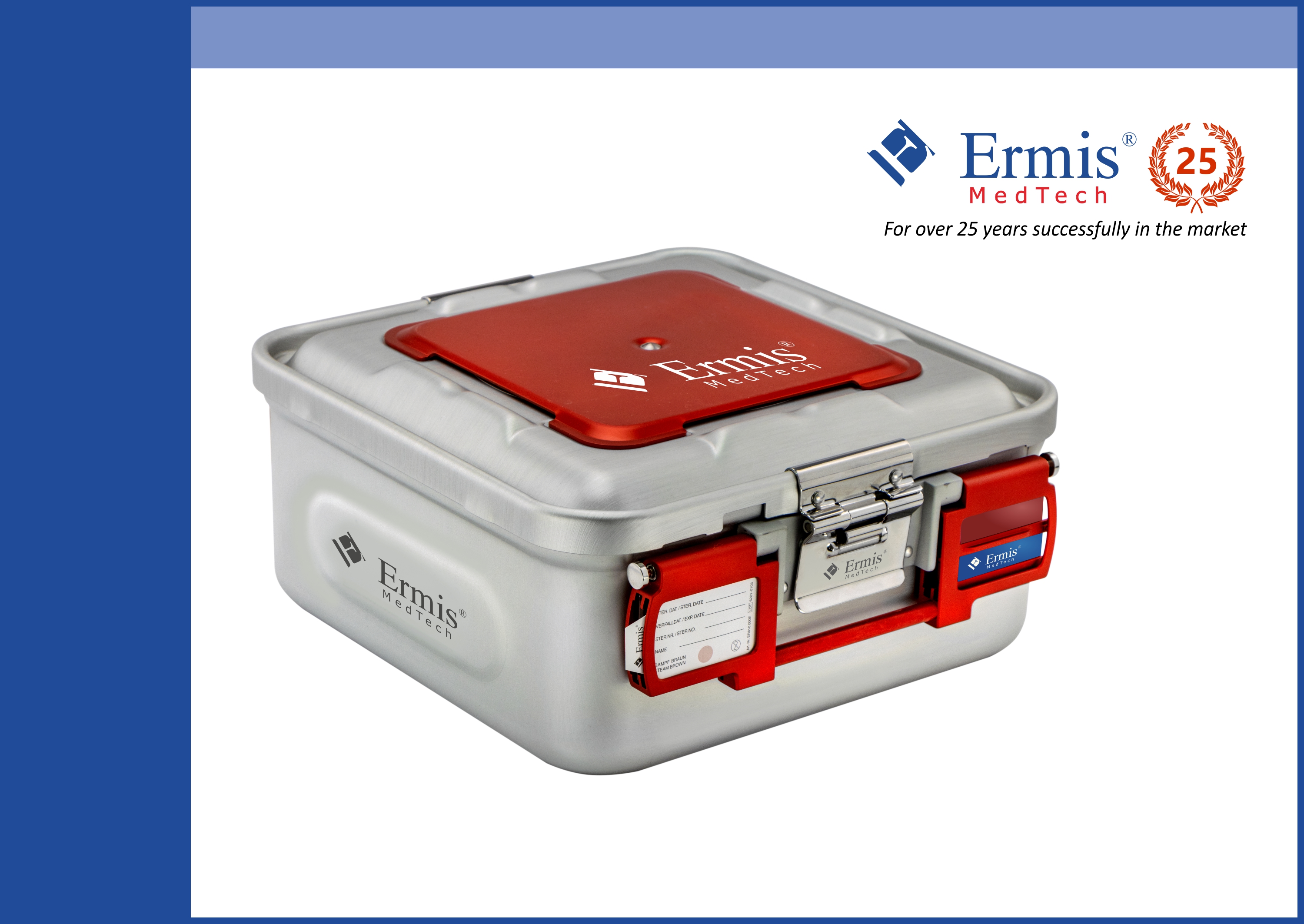ER - Standard Model: Sterilization container with single use paper filter or 1200 cycles PTFE filters with aluminium cover and colored handles.