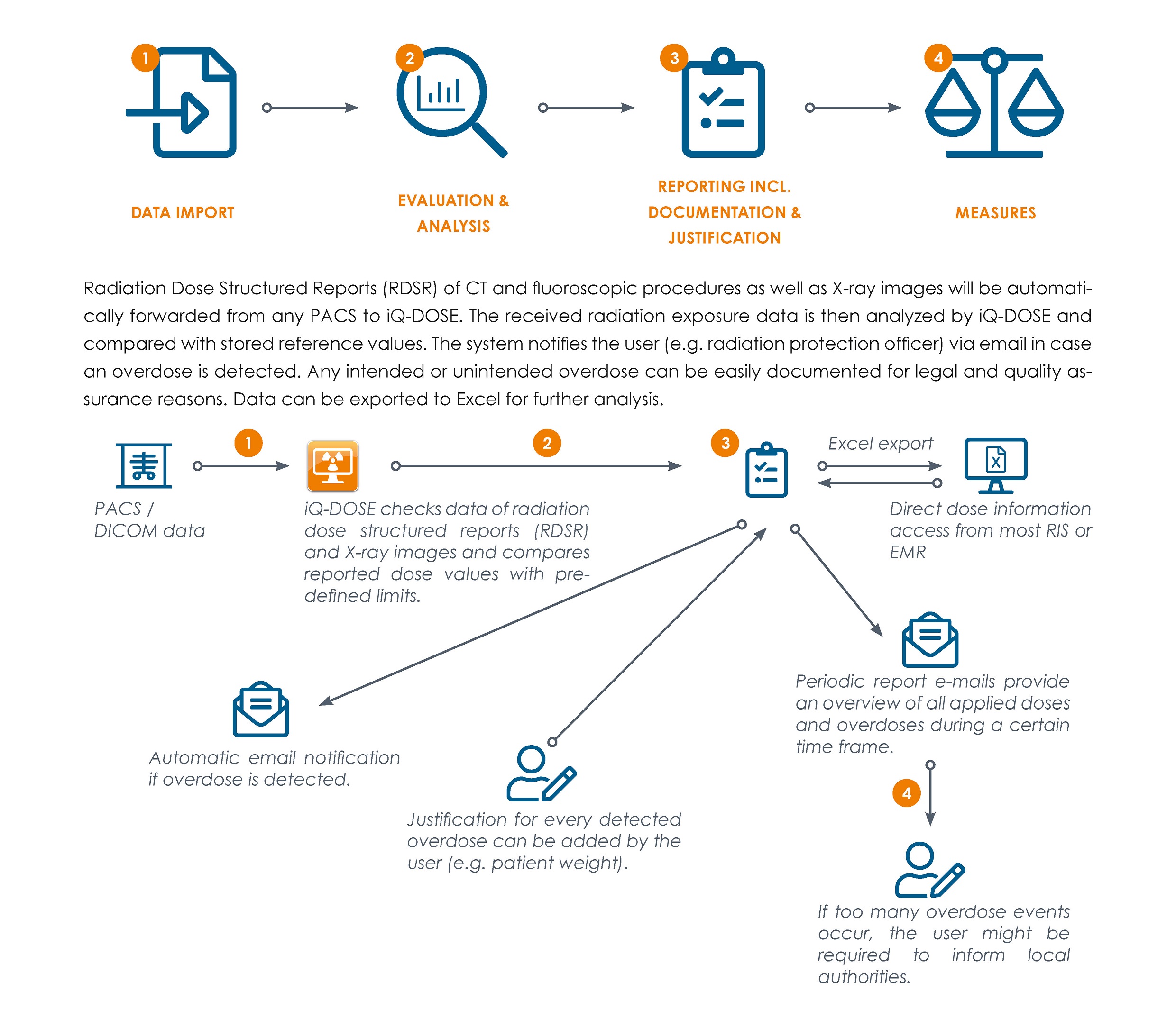 iQ-DOSE allows to automatically monitor and document the radiation dose applied during imaging procedures and creates automatic overdose notifications to enable medical institutions to immediately take needed measures and to meet legal requirements.