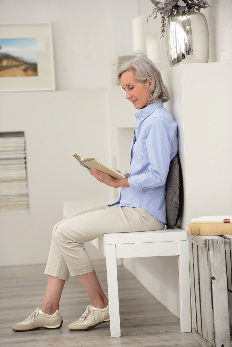 - placed behind your back: relief – perfectly supports the lumbar lordosis, enhances the natural sitting position and simultaneously incorporates back relaxation and gentle massage