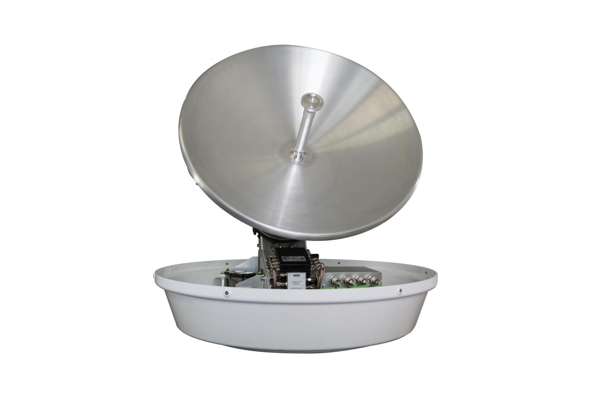 Maritime VSAT antenna with 60 cm dish size and 3-axis motion system for Ku-band services.