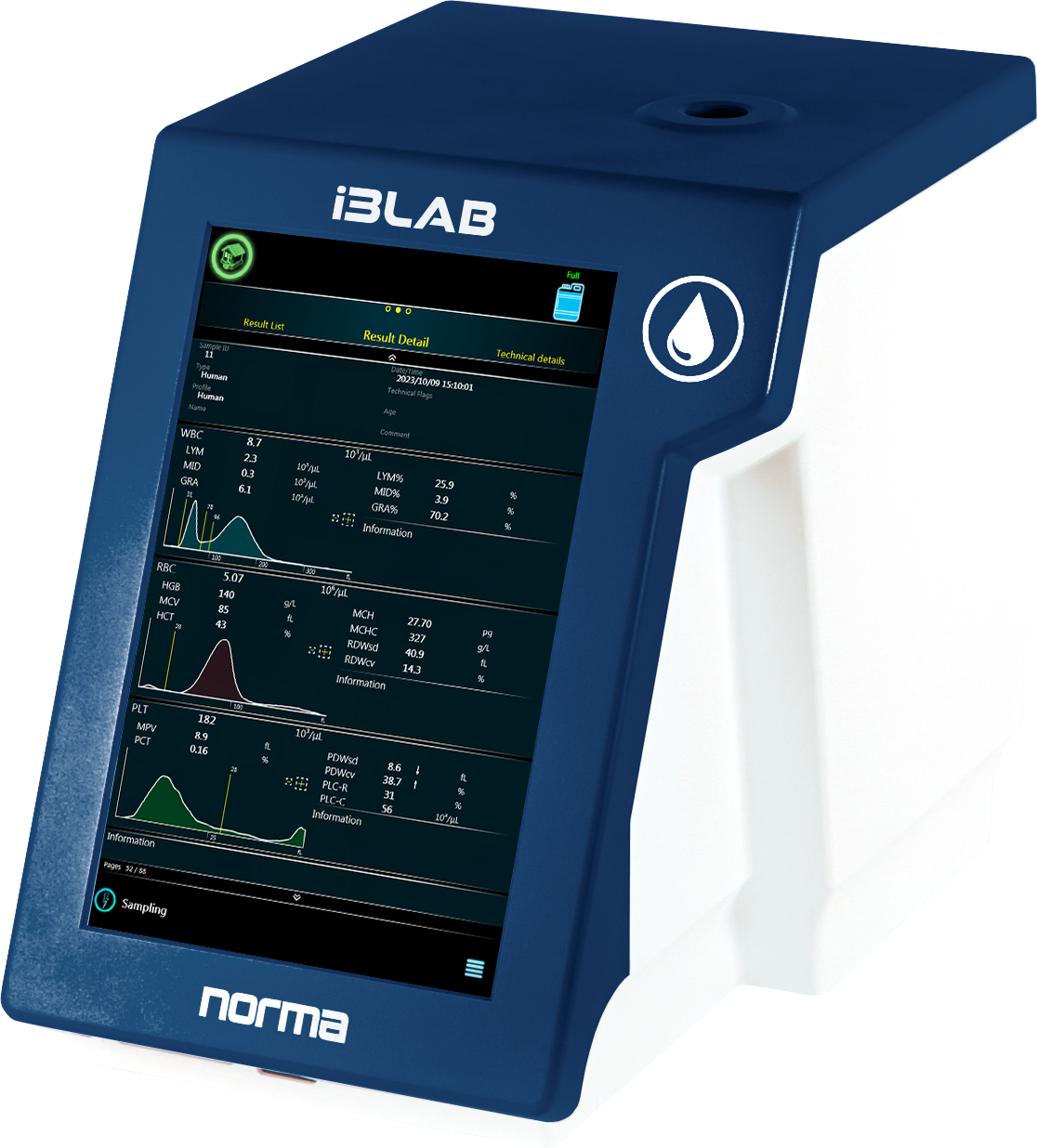 The i3LAB is a smart, 3-part differential hematology analyzer with closed vial sampling with an innovative and handy design. The i3LAB provides a 22-parameter complete blood cell count report that includes WBC, RBC, and PLT histograms, using the volumetric impedance method for the detection of red blood cells (RBC) and white blood cells (WBC) and photometric method for the measurement of hemoglobin (HGB) levels.