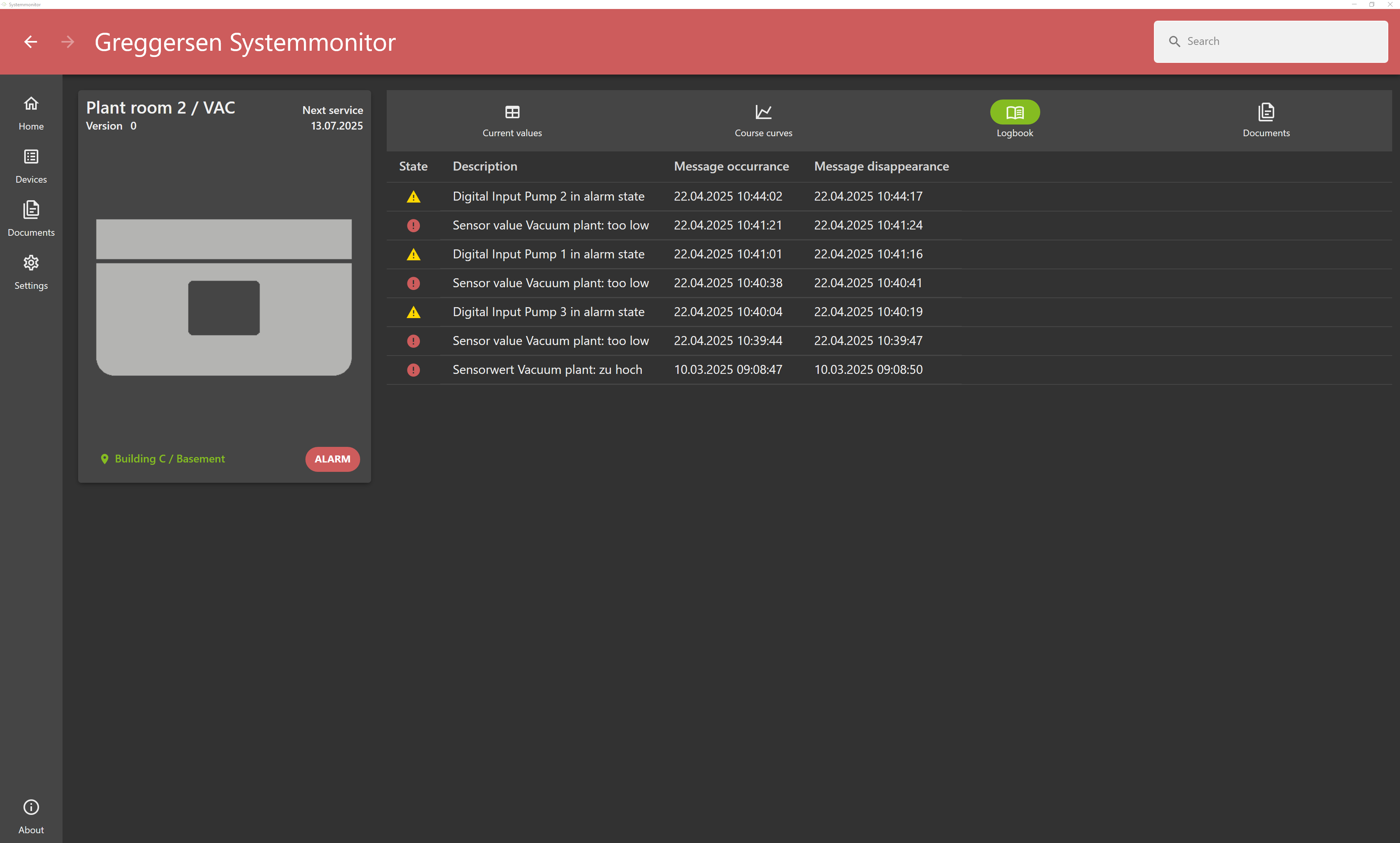 The user interface allows for easy supervision of all connected devices and systems. It provides a centralized display of live and historical data (up to 30 days) on a dashboard where key information such as pressure values and alarm states across different areas is visible at a glance. Detailed views for specific monitoring points offer precise status updates, such as alerts for connection loss due to damaged equipment or similar issues.