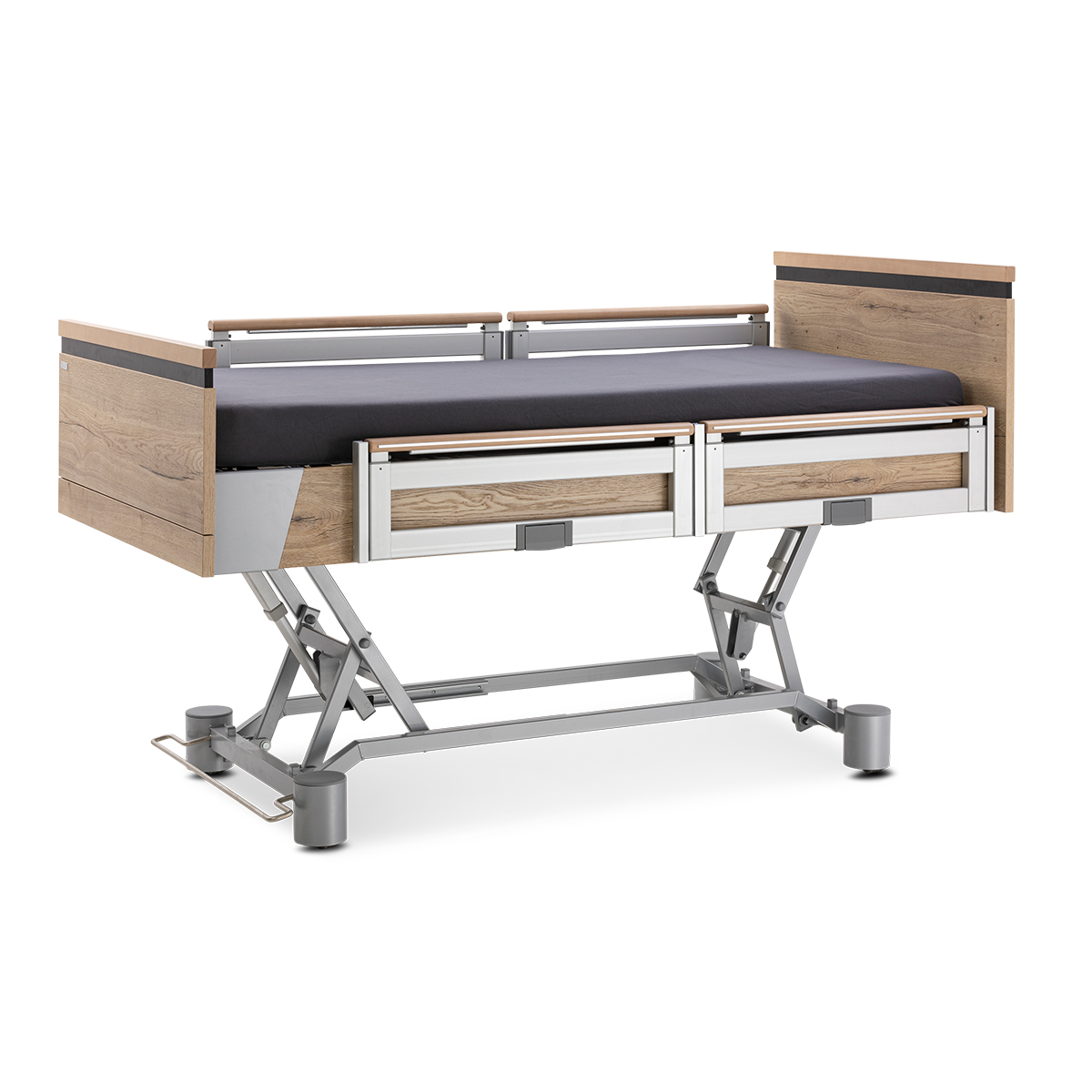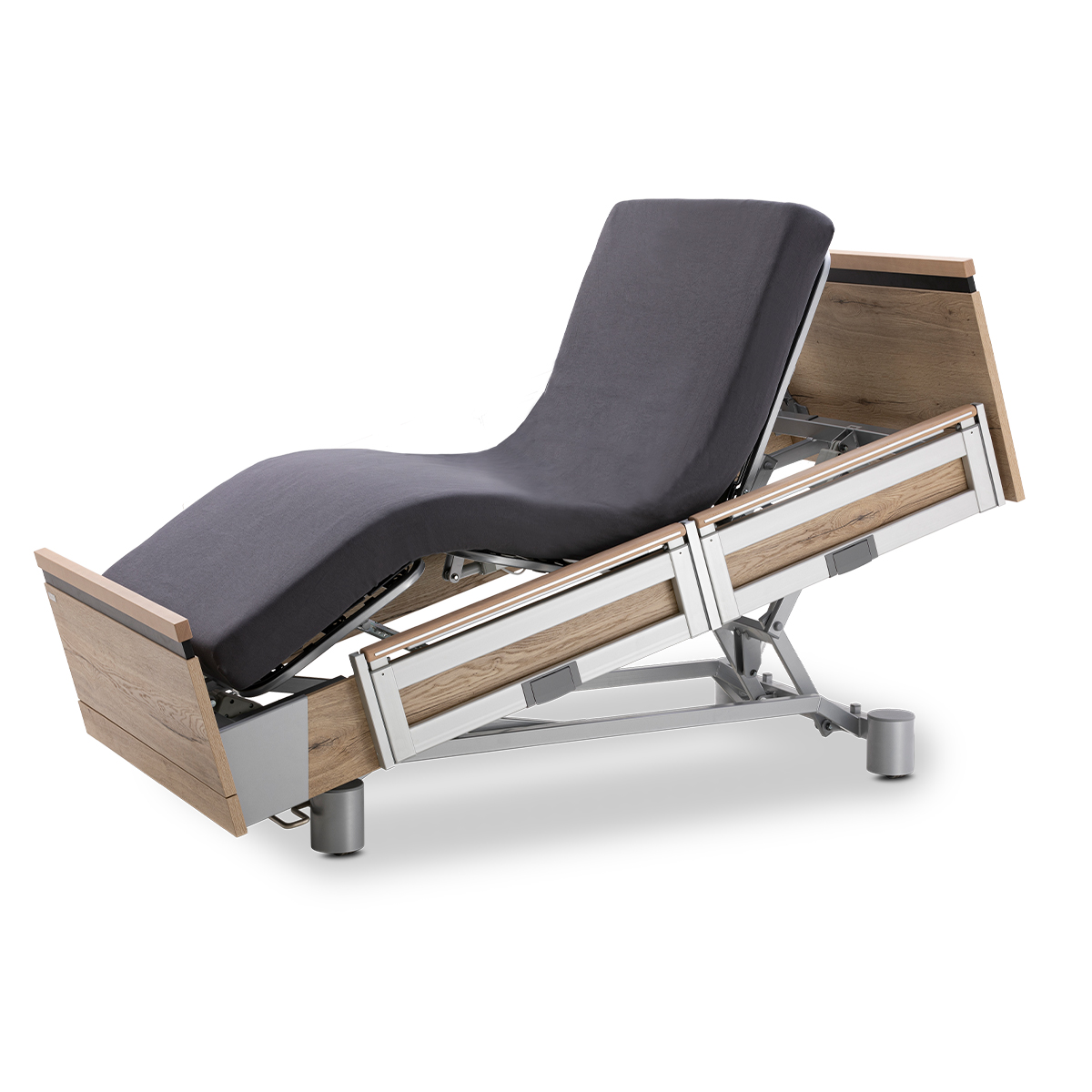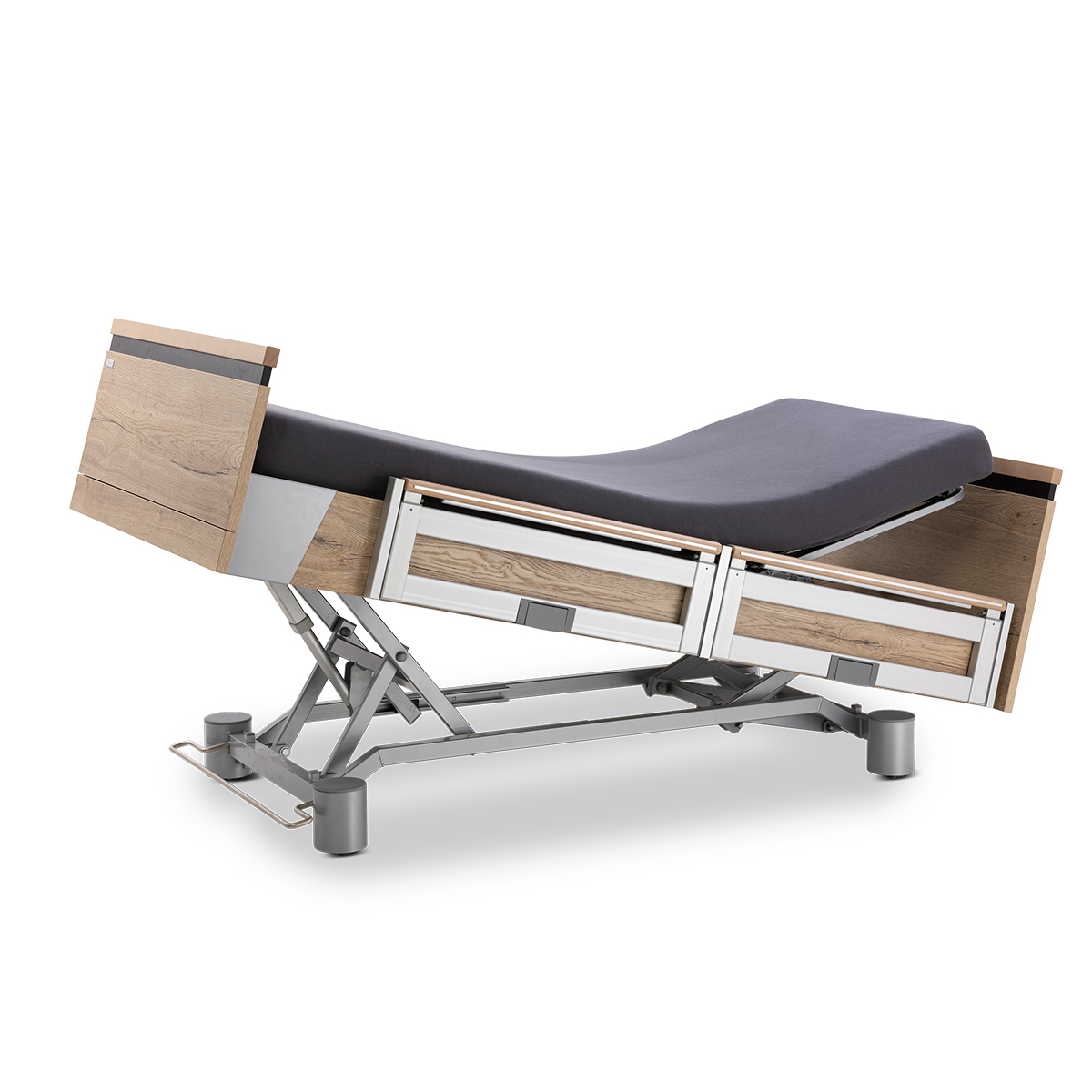 The high-quality material mix of anodised aluminium and solid wood elements emphasise the high product quality of the premium care bed.