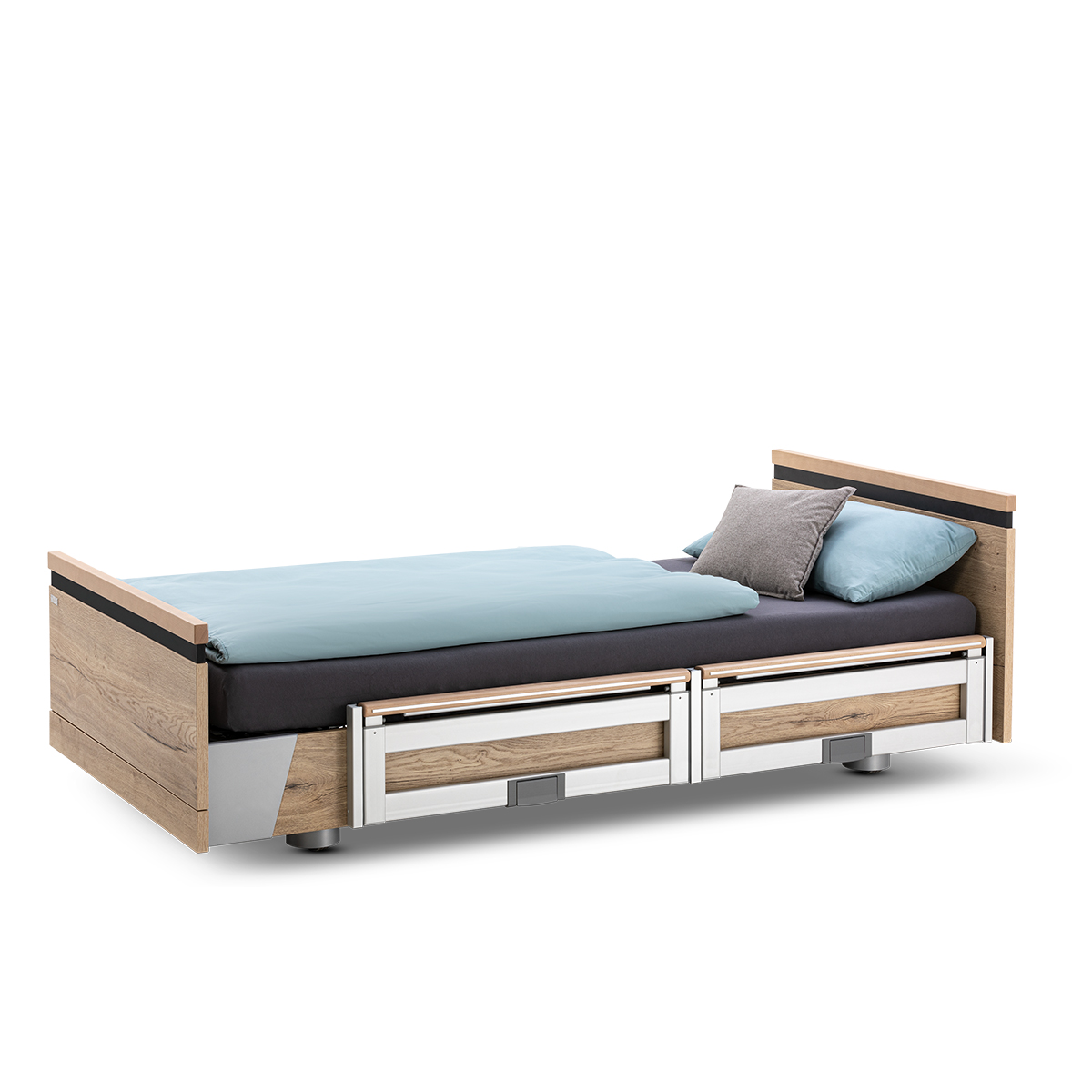 Fall-prone residents in particular benefit from the AURA’s low position, as the bed height significantly reduces the risk of injury as a result of falling out of bed. Combined with the vertically retractable side rail system, AURA offers comprehensive additional functions to make daily care processes easier and to increase user comfort.