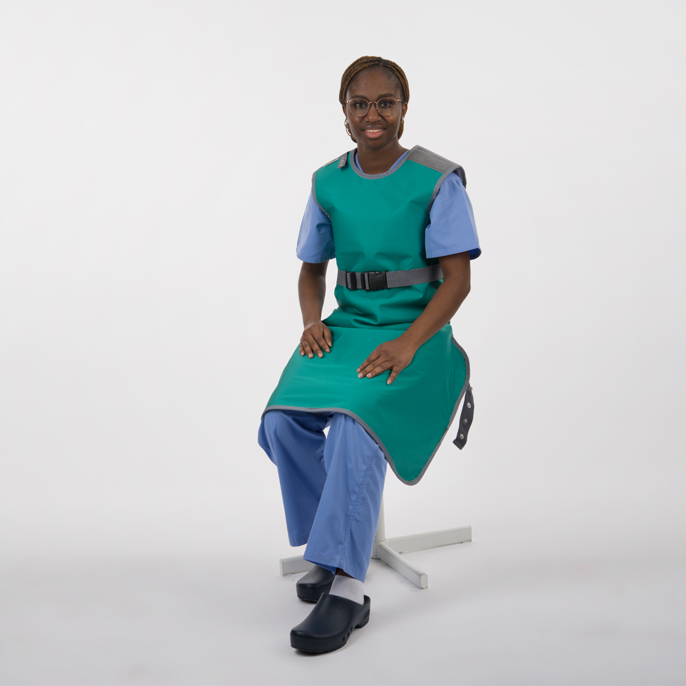Protection Especially for Seated Activities Radiation protection aprons are already standard equipment in different departments, e.g. urology, anaesthesia, etc.. However, the currently used front protective aprons are designed for standing positions. But especially in the above mentioned departements, some interventions are performed with the operator in a seated position. This holds the risk that the gonads will be exposed to a considerably higher dose than when standing when a regular front protective apron is used.