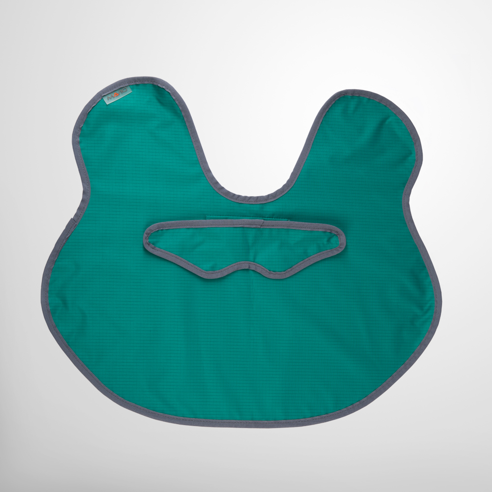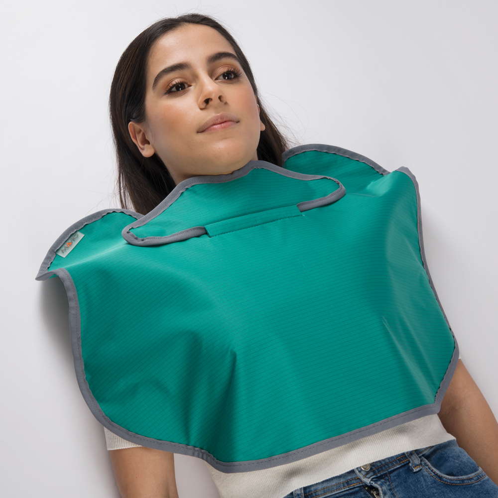The protector can be positioned easily without further aids or fastening systems. The reduction of radiation exposure for the thyroid gland is approx. 65%, for the sternum approx. 80%, and for the breast and shoulder area approx. 90%.