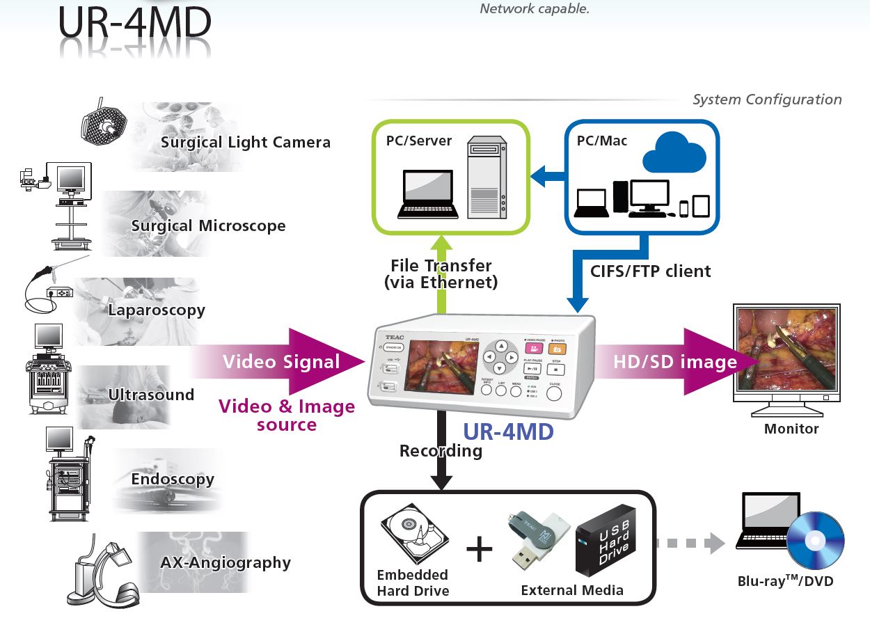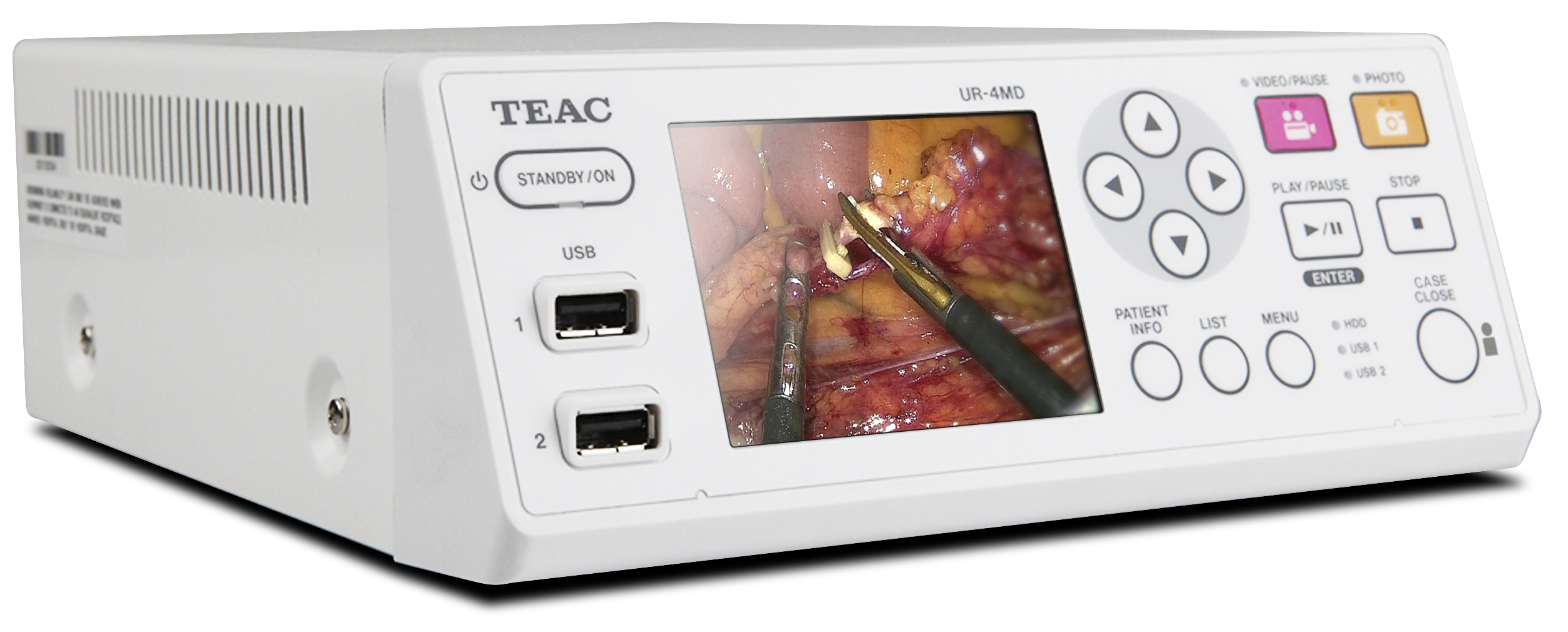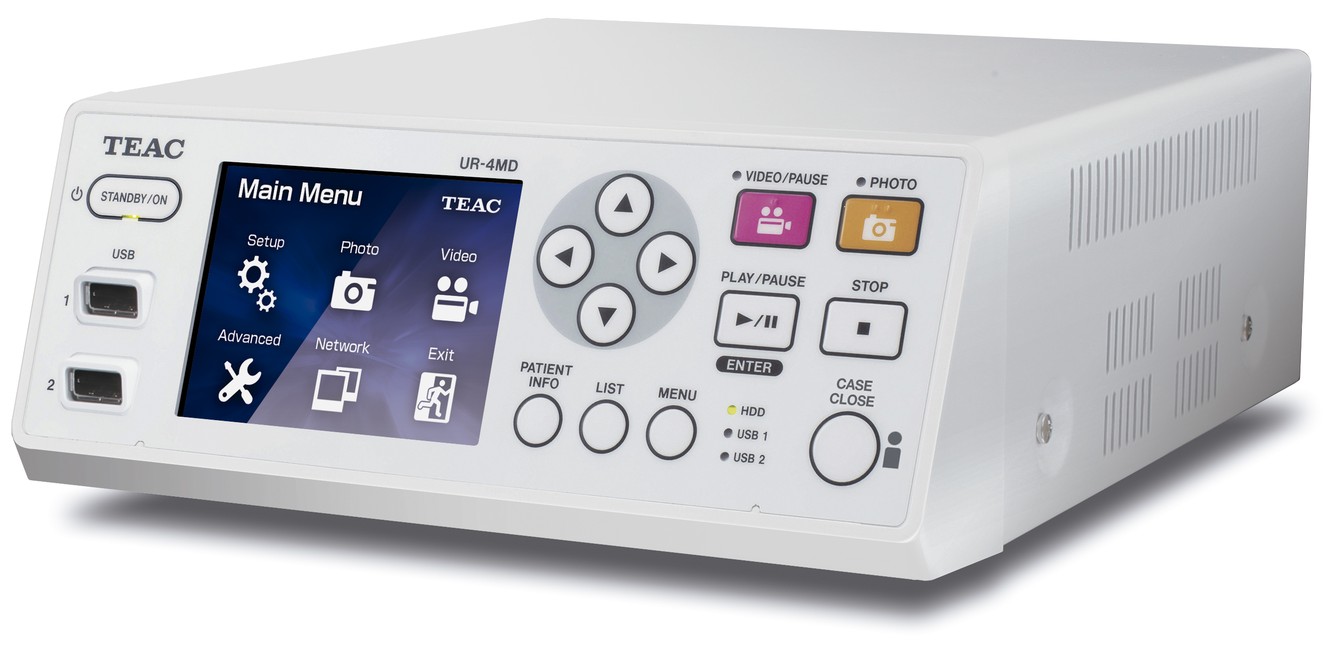 The TEAC UR-4MD is a successful high-definition medical video recorder designed for quick setup and ease of use, yet it includes a robust list of features and capabilities. With auto-sensing video connections and automatic video resolution detection, setup is quick and easy. The front control panel allows users to intuitively record videos and photos in crystal-clear Full HD at the press of a button or footswitch. A built-in hard drive enables reliable recording and data backup, however, you can also record simultaneously to USB memory and USB hard drives to archive, share and play back videos and still images on other devices and locations. The UR-4MD is also network-capable and can be upgraded with a DICOM option.
