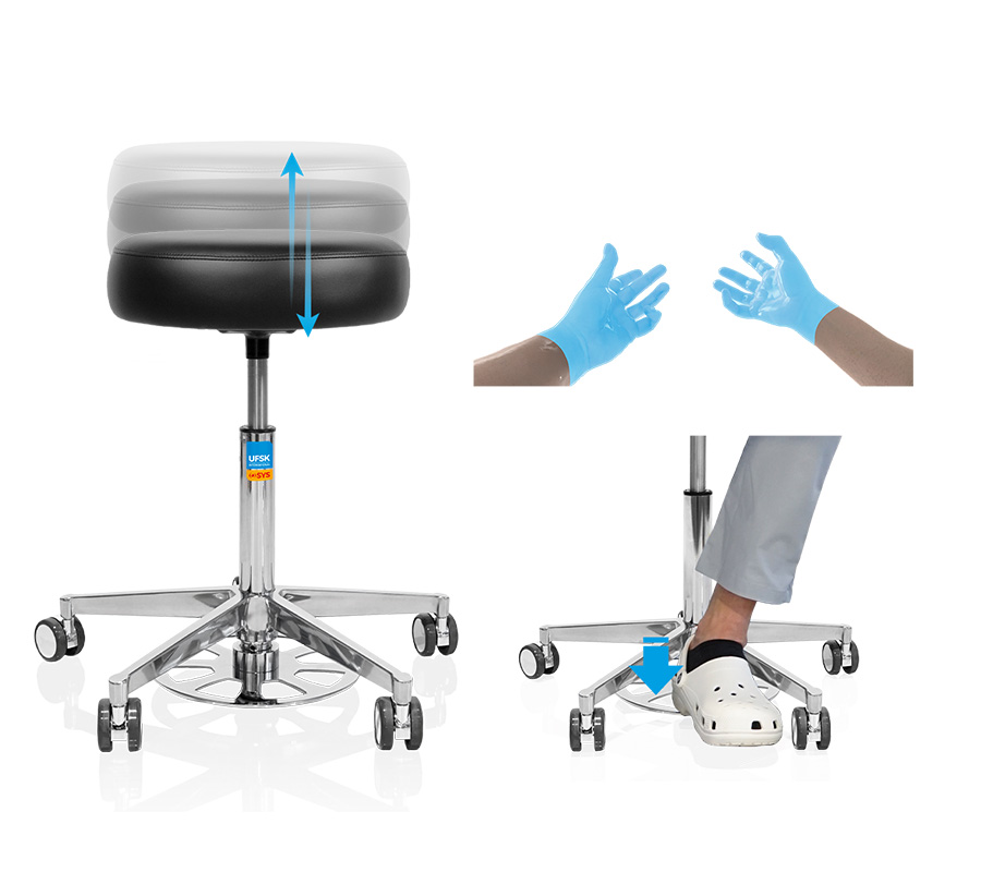 - Sterile, comfortable height adjustment via foottriggered gas pressure spring (easyLine F)