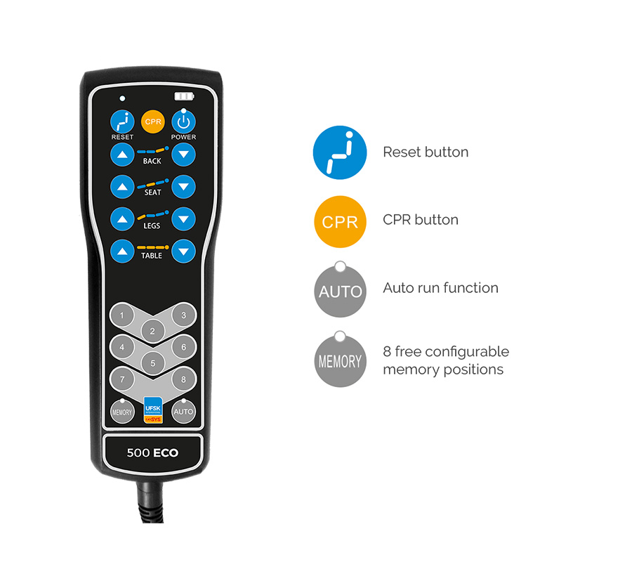 - 4 powerful drives for adjusting the backrest, footrest and seat elements as well as the overall height